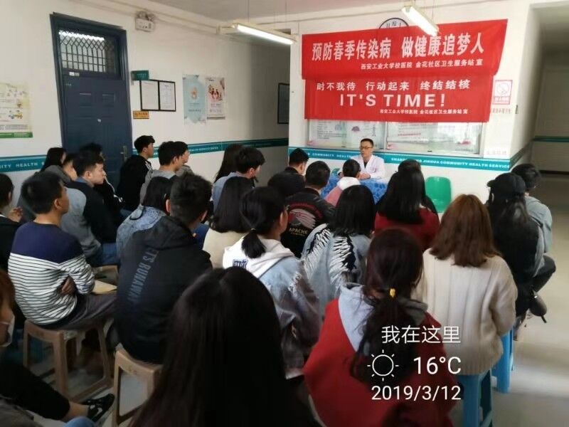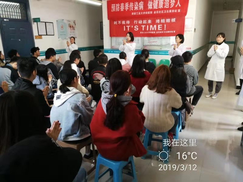 校医院王喜军老师从春季气候变化、昼夜温差、室内空气相关因素导致的细菌、病毒繁衍等呼吸道传染病高发原因讲起,以流行性感冒、水痘、流行性腮腺炎、手足口病这四种春季高发传染病为例,从传播途径、主要症状、易感人群、预防措施四个方面向同学们作了详细介绍。叮嘱同学们做好以下几个方面:1、搞好班级寝室环境卫生,保持室内和周围环境清洁;经常开门窗通风或喷洒空气清洁剂,常晒被褥,经常开窗通风透气,保持空气清洁。2、春天气候多变,早晚温差大,要根据天气变化,适时增减衣服,防止受凉生病。3、勤洗换衣裤,注意保持个人卫生清洁,保持良好的卫生习惯,打喷嚏、咳嗽时不直接面对他人,减少传播疾病的机会。