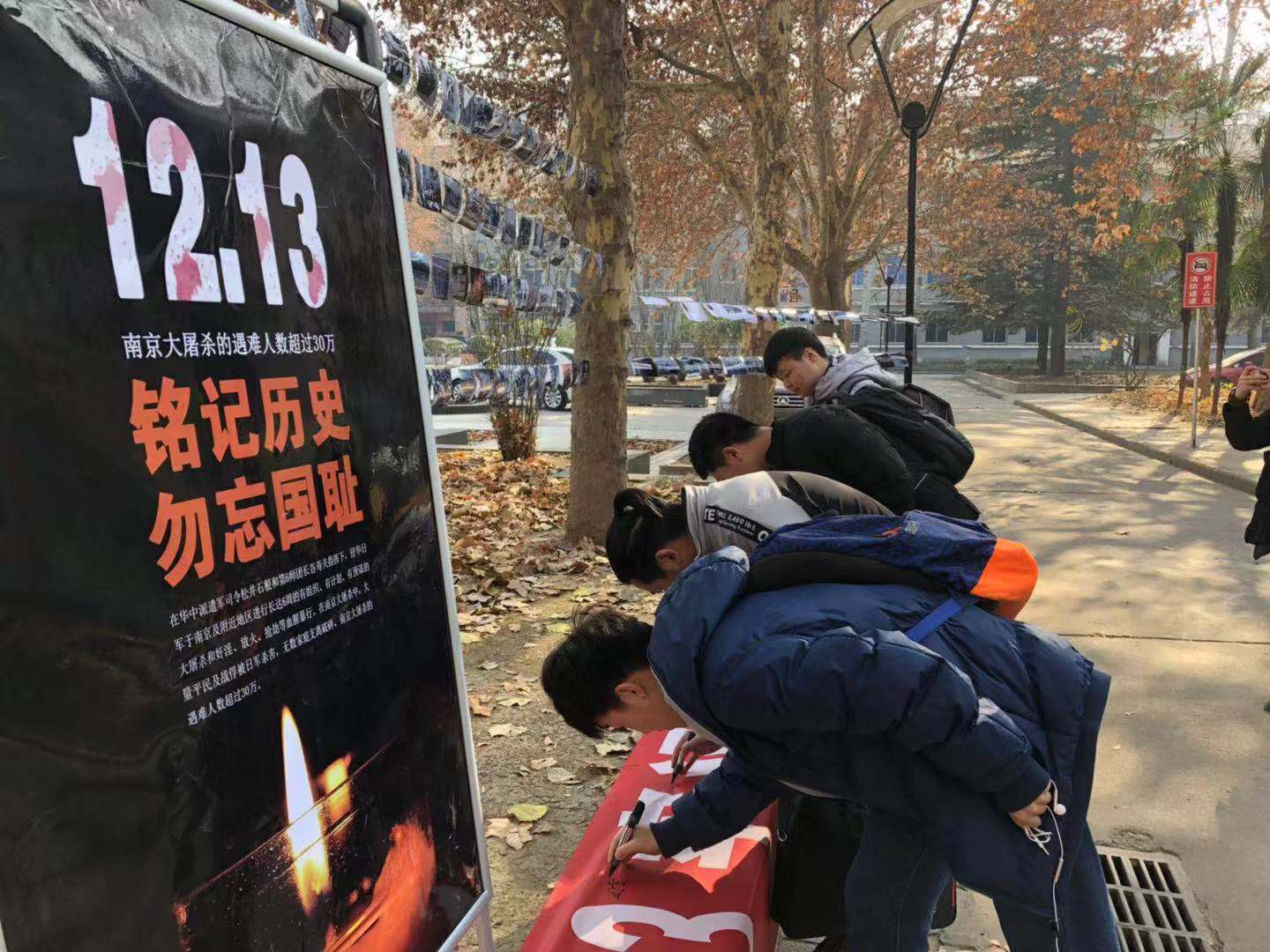 2018年12月13日是第五个南京大屠杀死难者国家公祭日。为教育员工牢记历史、勿忘国耻,凝聚力量、奋力拼搏,威廉希尔williamhill艺术与传媒学院于2018年12月13日13:00在金花校区喷泉广场举办“12.13牢记历史,勿忘国耻,振兴中华”图片展和签名活动。