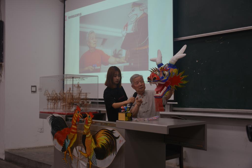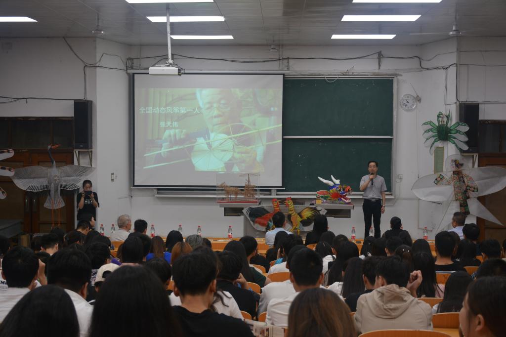 周格杏首先向同学们介绍了张天伟老师的具体情况,并就碑林区非物质文化方面的工作做了介绍;接着,王若鸿在致辞中希望能够借此次活动把传统文化和艺术设计得到一个完美的结合。在随后两个小时的讲座中,张天伟老师不仅现场展示了秦始皇铜车马、公鸡斗架、皮影人物、猪八戒吃西瓜等形态各异的动态风筝作品,还讲述了他对动态风筝的热爱缘由,并揭秘了张氏风筝的风力机械传动装置构件制作技艺。张老师精湛的工学技艺和深厚的艺术素养,让广大师生近距离感受到动态风筝的魅力,也博得了大家热烈的掌声。