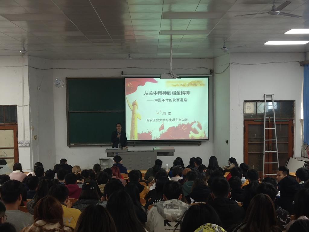 程森老师从陕西关中所处的地理位置讲起,作为中国革命重要的精神家园,陕西与中国革命有着密切的关联。接着程森老师从关中人闹革命、关中精神的内涵、关中精神形成的渊源、关中精神的践行者,关中精神的价值等方面向同学们系统讲授了关中精神形成过程及内涵,程森老师将关中精神概括为:崇实爱国、坚韧不屈、奋击为先。同时程老师从照金精神从哪里来、照金精神的缔造者、照金精神的内涵以及照金精神与关中精神的关系等方面为大家分享了照金精神的形成过程和历史意义,他说:关中精神在前,照金精神在后。关中精神集中反映关中地域文化风貌,推动了近代关中地区革命的发展。为后世中共在陕西地区从事革命活动起到了催化作用。照金精神是对关中精神的继承与突破、创新。程森老师谈到中国革命陕西道路的实质:是在近代中国民族民主运动浪潮影响下,受全国革命浪潮的影响,结合陕西地域历史、文化、地理等特点,以青年为骨干,追寻真理,爱国爱民,勇于担当,开创的革命道路。