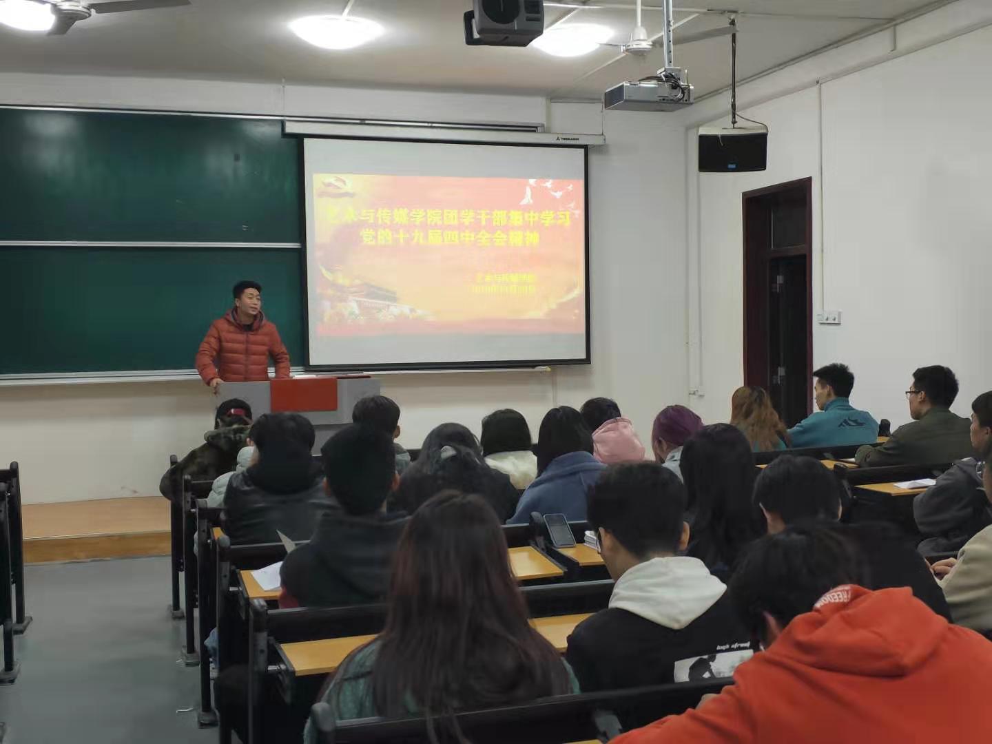 2019年11月20日,艺术与传媒学院团学干部在金花校区教2-207集中学习党的十九届四中全会精神,全体班长、团支书、团委成员参加了此次学习,学习会由院团委副书记李晨馨主持。