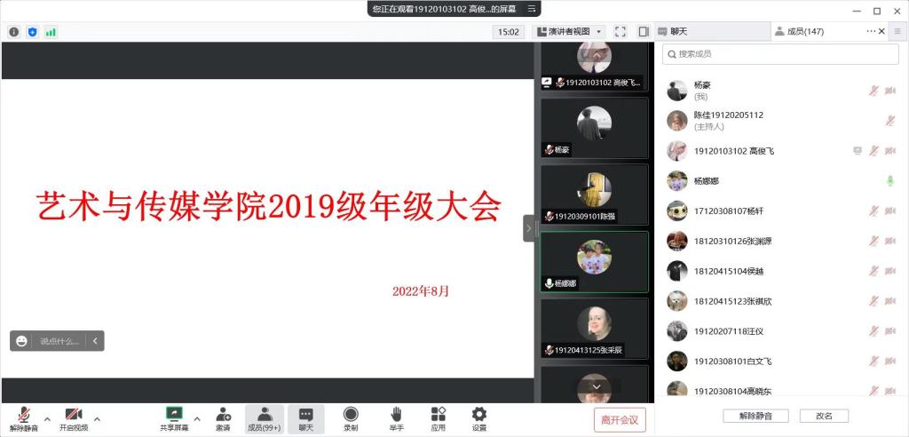 为做好员工返校工作,加强毕业生思想教育,为毕业生指明就业方向。艺术与传媒学院2019级辅导员杨娜娜于9月5日晚19:30通过腾讯会议召开年级大会。2019级全体员工参加会议。