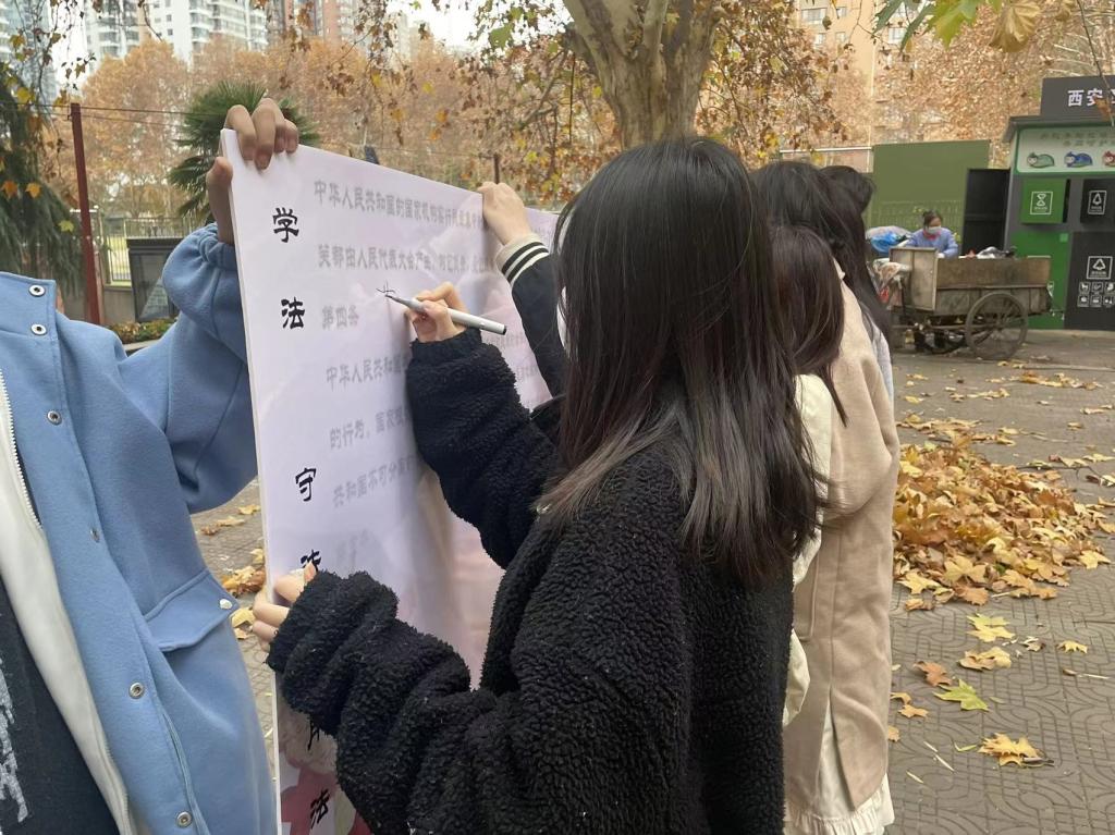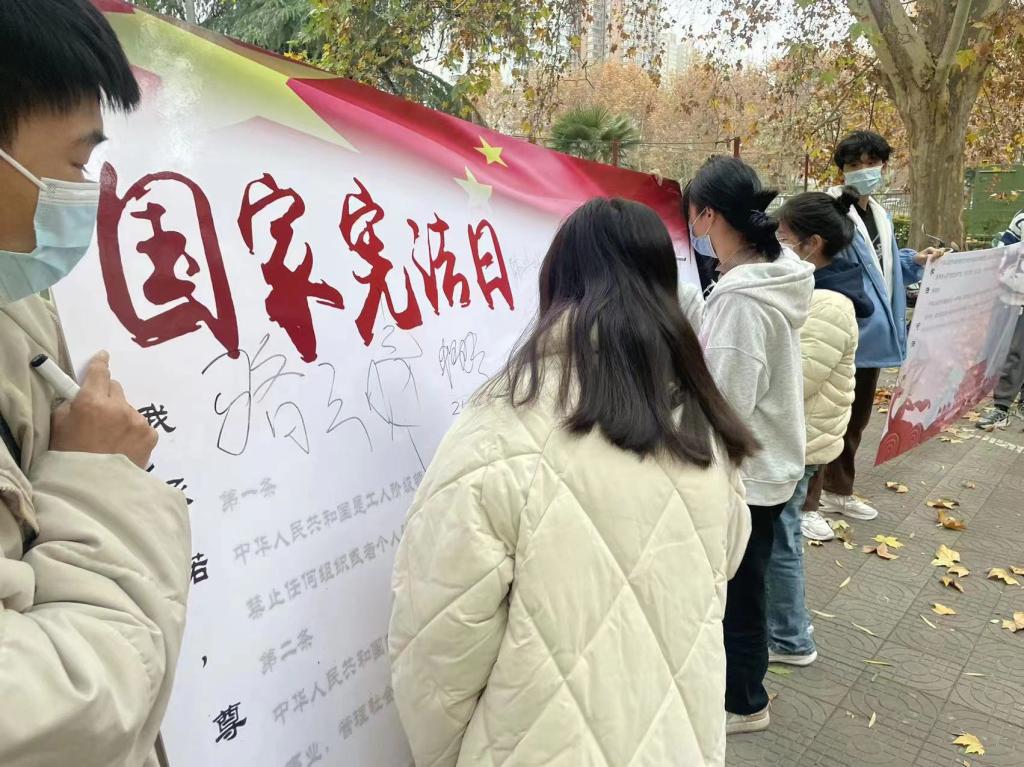 艺术与传媒学院2021级于2022年11月20日在十一公寓楼下开展了主题为“弘扬宪法精神,树立宪法权威”的宪法宣传和展板签名活动。