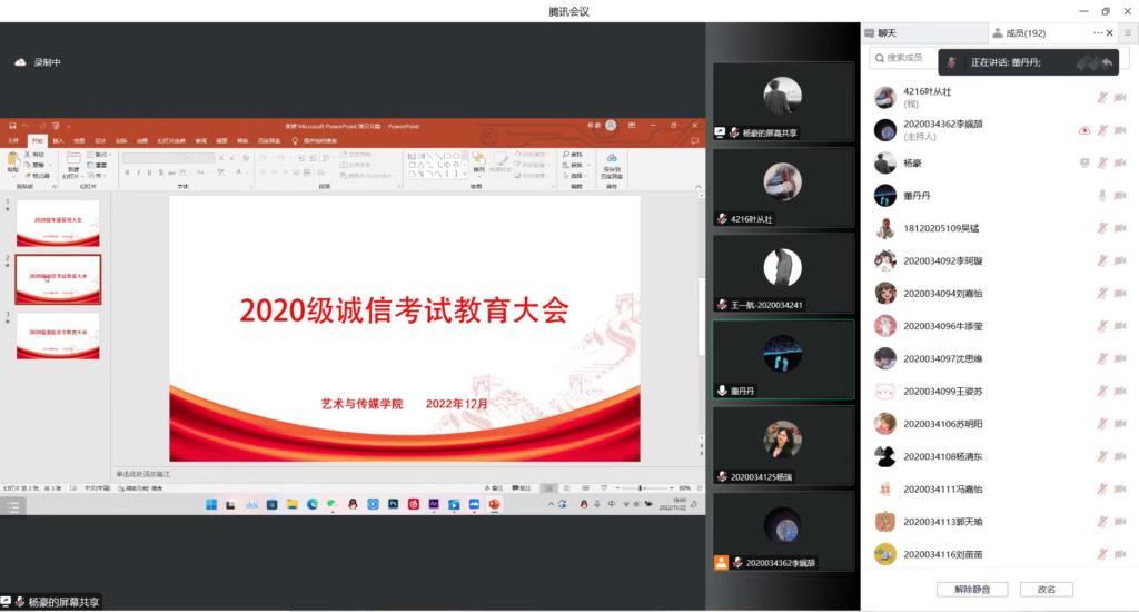 期末考试即将来临,为加强同学们的诚信意识教育,认真复习备考,艺术与传媒学院2020级于12月14日开展诚信考试教育大会,辅导员董丹丹主持会议,2020级全体员工参加此次会议。