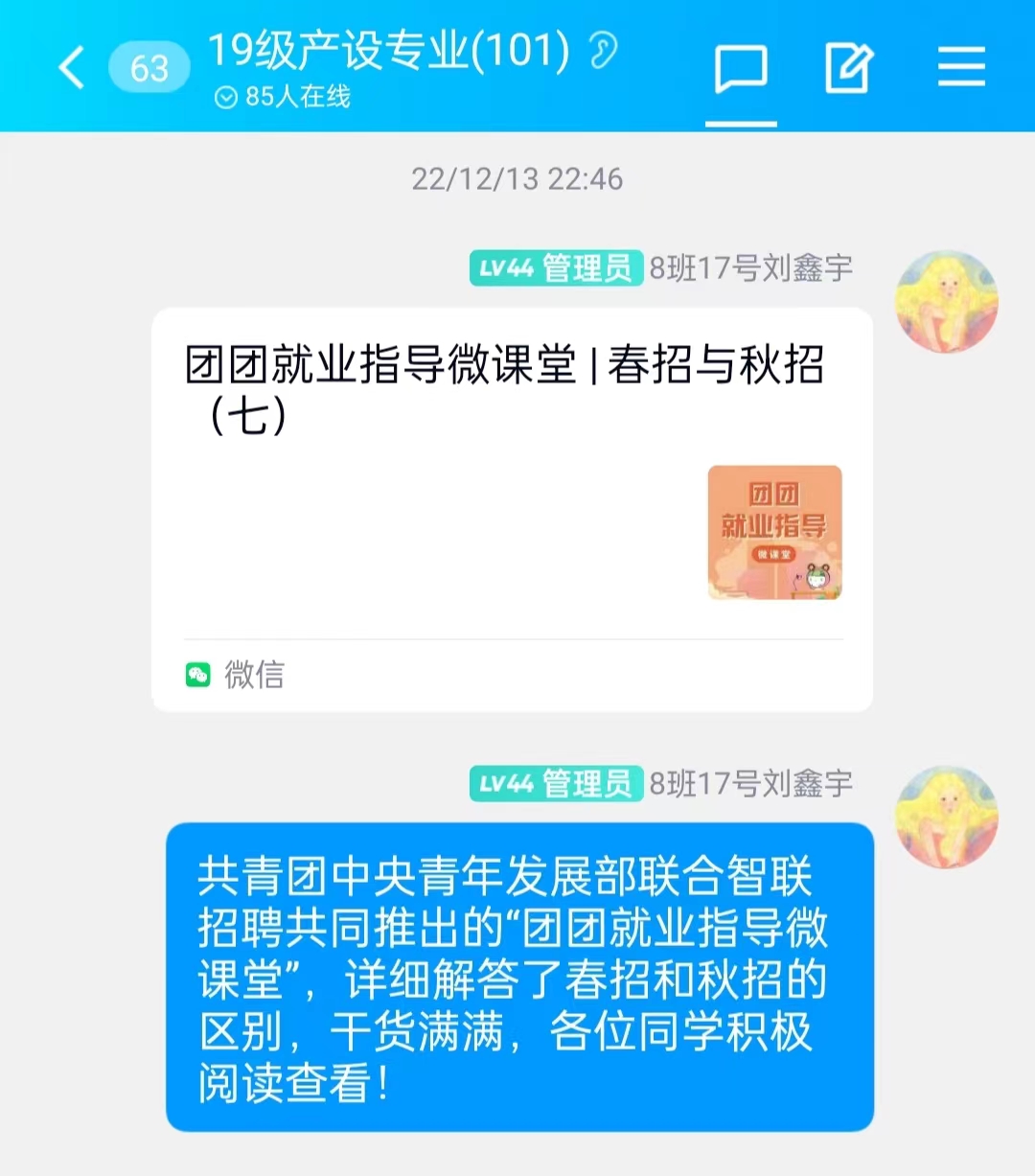 为切实做好2023届毕业生就业工作,帮助毕业生了解当前就业形势和职场现状,树立积极就业观念,找准职业定位,提高求职能力,解决就业中遇到的难题,促进毕业生高质量就业。2022年12月至2023年1月,艺术与传媒学院积极组织动员毕业生参与由共青团中央青年发展部联合智联招聘共同推出的“团团就业指导微课堂”系列活动。