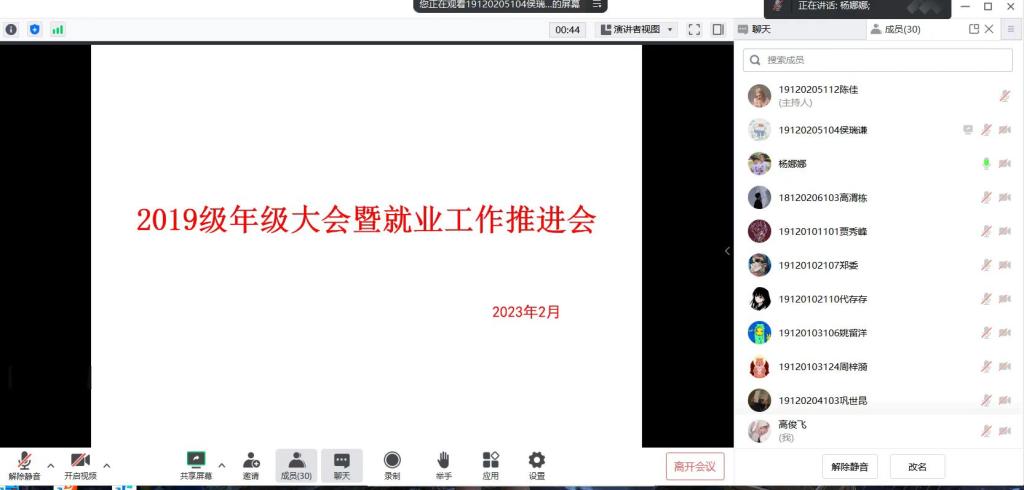 为更好地促进2023届毕业生就业工作,并积极落实新学期学院工作安排, 艺术与传媒学院2019级于2月24日晚8点线上组织召开“2019级年级大会暨就业工作推进会”。辅导员杨娜娜主持,2019级全体员工参会。