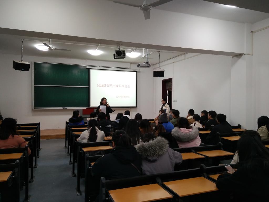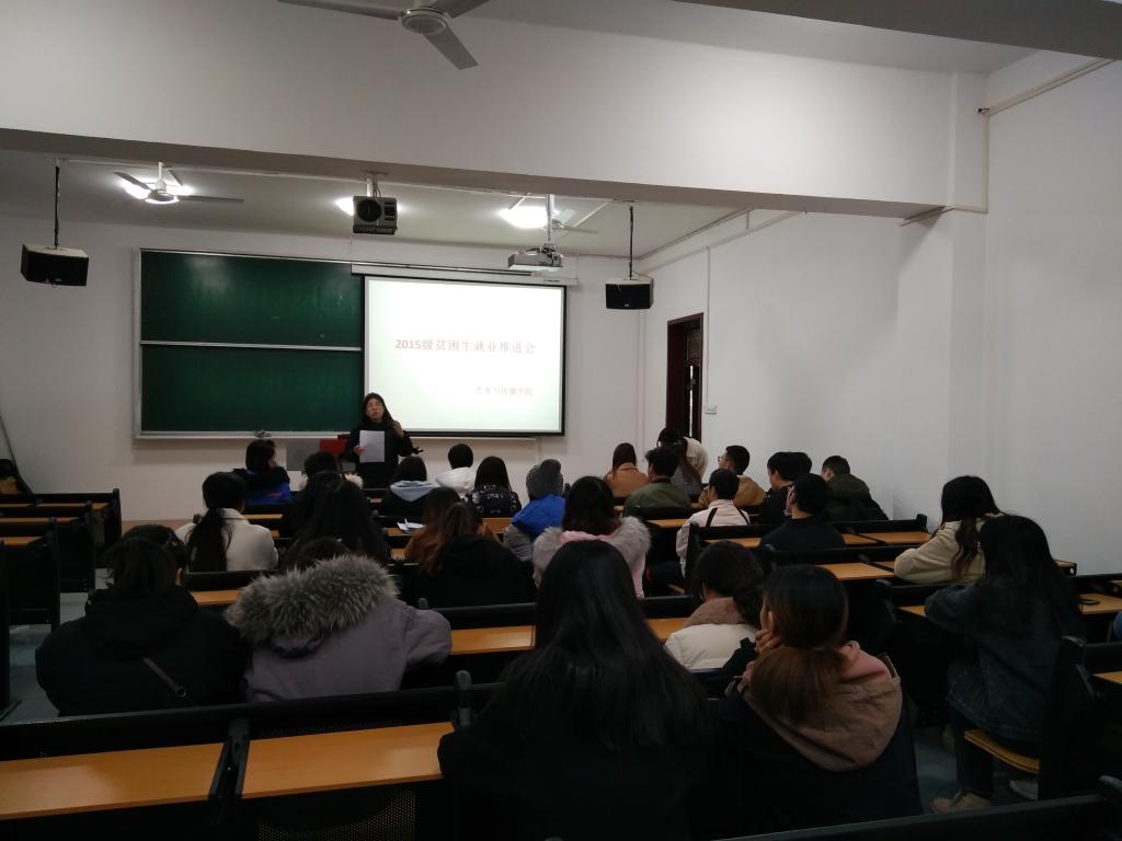 为了进一步帮助贫困毕业生树立正确的就业观和择业观,使其了解就业形势,提高就业技能早日就业,威廉希尔williamhill艺术与传媒学院于2018年 11月29日上午10:00在金花校区J2-201举行2015级贫困生就业推进会。参加此次会议的有15级辅导员杨娜娜老师,杜俊瑶老师以及2015级全体贫困生。此次推进会杨娜娜老师主持。